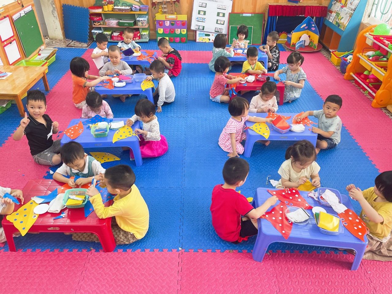 Sau đây là một số hình ảnh của giờ học tạo hình “Xé dán đuôi diều” lớp 3 tuổi C2 trường Mầm non Đoàn Lập: