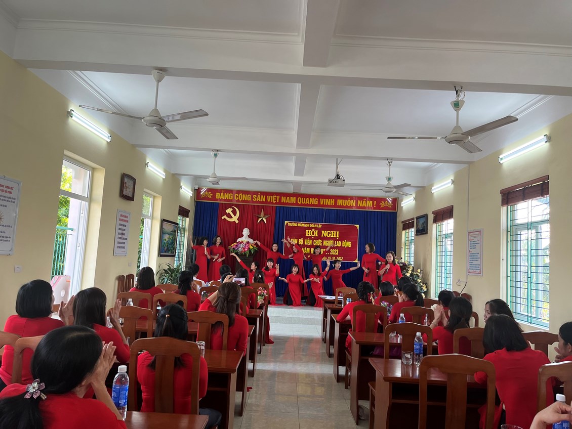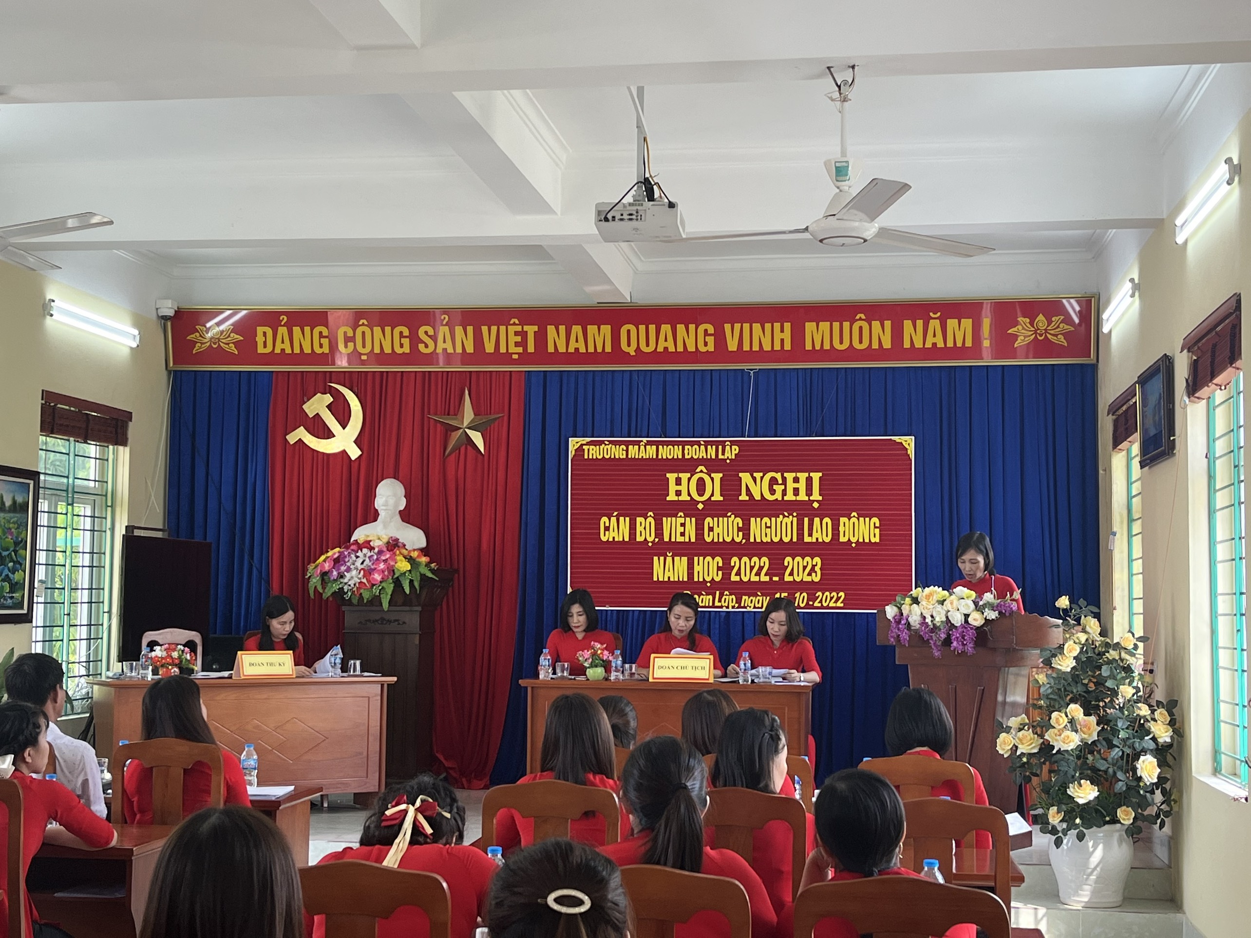Thực hiện kế hoạch và nhiệm vụ năm học 2022-2023, được sự nhất trí của Phòng GD&ĐT, LĐLĐ huyện Tiên Lãng, UBND xã Đoàn Lập, ngày 15/10/2022 trường MN Đoàn Lập tổ chức Hội nghị cán bộ viên chức, người lao động năm học 2022-2023 nhằm đánh giá kết quả thực hiện nhiệm vụ năm học 2021-2022, xây dựng phương hướng thực hiện nhiệm vụ năm học 2022-2023.