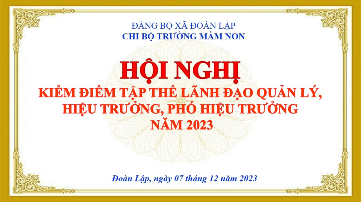 Ngày 06, 07/12/2023, trường Mầm non Đoàn Lập đã tổ chức Hội nghị kiểm điểm tập thể lãnh đạo quản lý, Hiệu trưởng, Phó Hiệu trưởng năm 2023, Hội nghị kiểm điểm đảng viên năm 2023.
