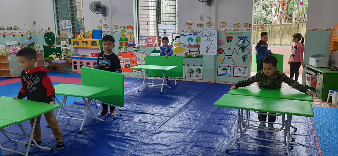 Trước khi ăn, các bé cùng cô kê bàn ghế. Việc này giúp rèn luyện cho trẻ biết tự lao động phục vụ và chia sẻ cùng cô những việc vừa sức.