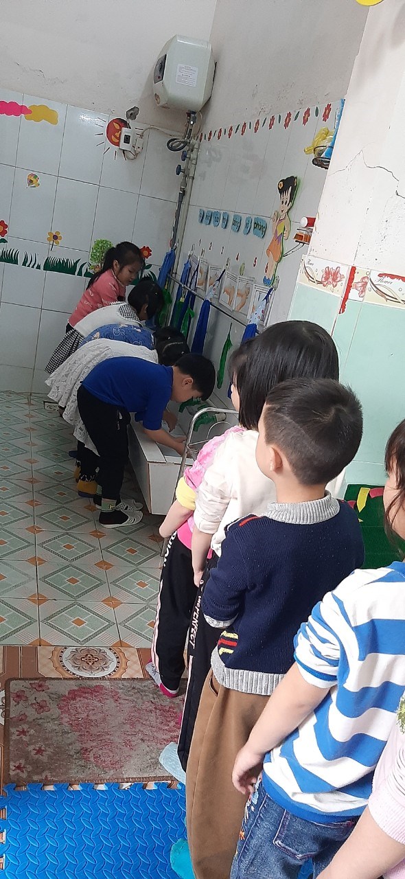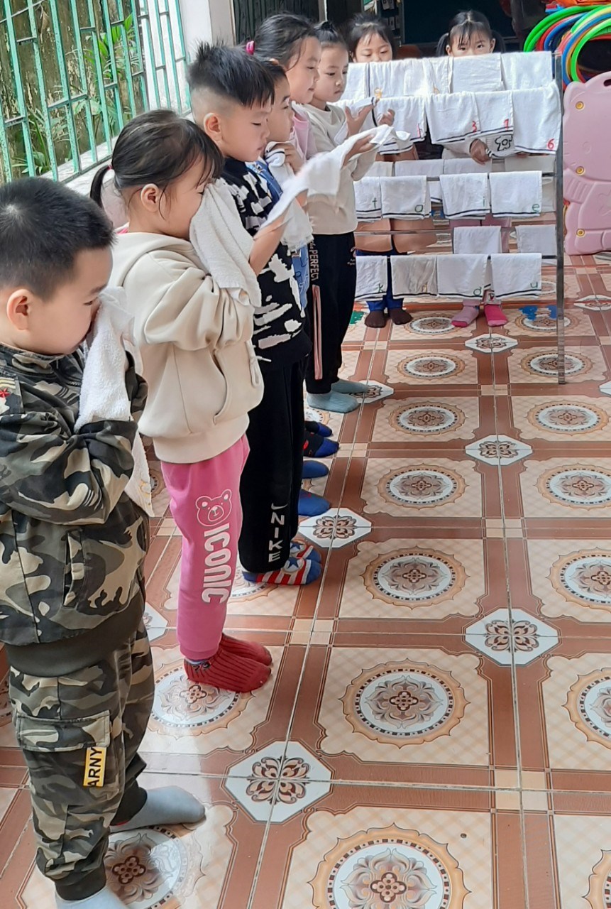 Thực hiện vệ sinh: rèn luyện thói quen rửa tay trước khi ăn và hành vi văn minh trong ăn uống cũng như hành vi văn minh chờ đến lượt nơi công cộng. Qua hoạt động này, trẻ được biết tại sao phải rửa tay bằng xà phòng trước khi ăn, được rèn luyện các thao tác rửa tay bằng xà phòng theo quy trình. Việc cho trẻ thực hiện rửa tay, lau mặt còn nhằm mục đích đảm bảo vệ sinh trong ăn uống ở nhà trường.