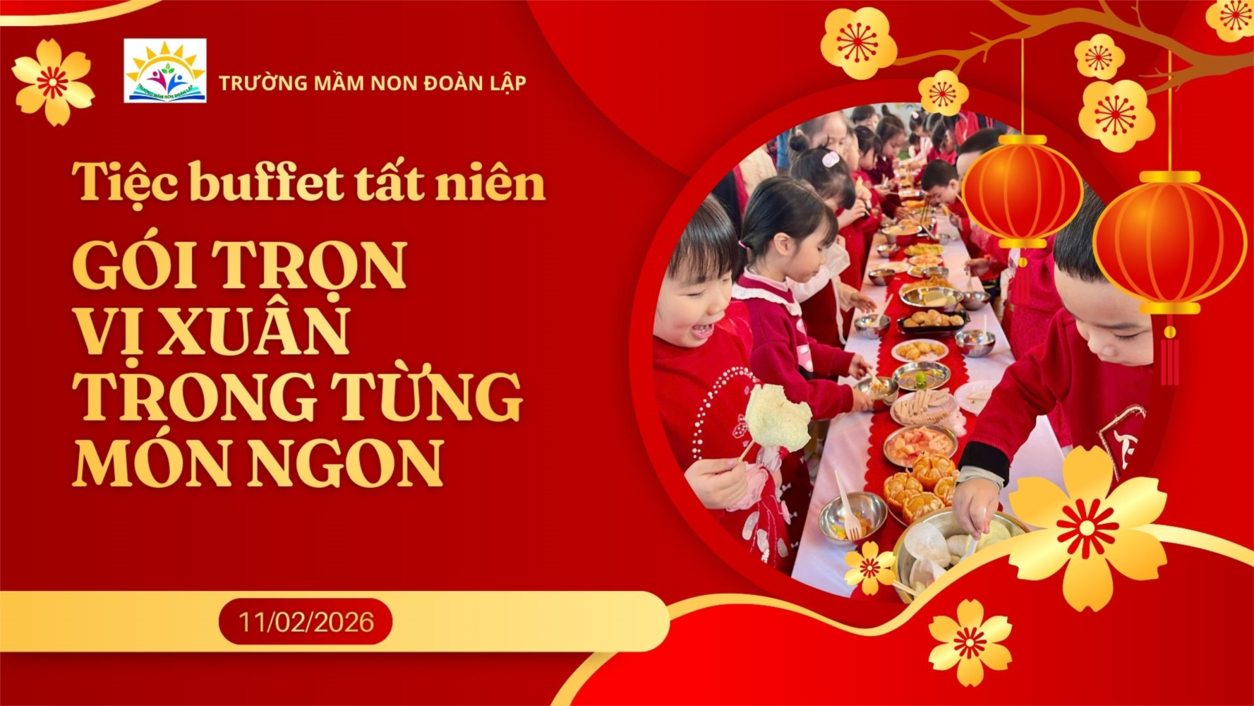 Sau những giờ phút trải nghiệm đầy sáng tạo tại các trạm du xuân, chiều ngày 11/02/2026, các bé trường Mầm non Đoàn Lập lại hào hứng bước vào một bữa tiệc đặc biệt - Tiệc Buffet Tất niên. Đây là món quà cuối năm đầy ý nghĩa mà nhà trường và các bậc phụ huynh dành tặng cho các con trước khi bước vào kỳ nghỉ Tết Nguyên đán.